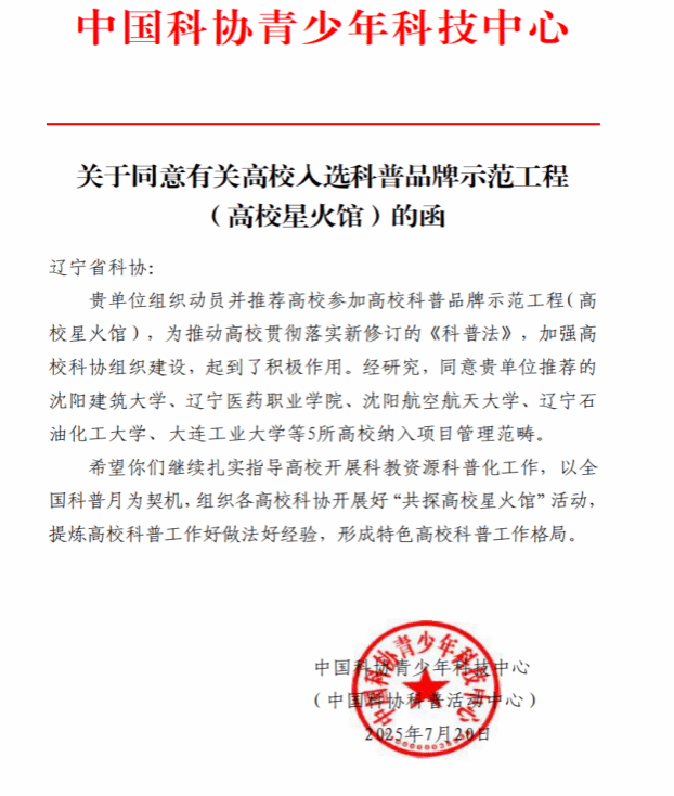 近日,中国科协青少年科技中心公布了高校科普品牌示范工程(高校星火馆)入选名单,我校脱颖而出,成功入选为建设高校,标志着我校在科普资源转化、社会服务能力及创新人才培养方面获得高度认可,科普工作迈上新台阶。