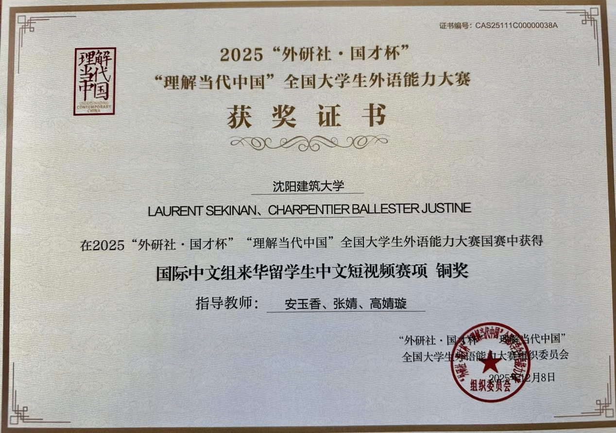 近日,2025“理解当代中国”来华留学生中文短视频大赛全国总决赛在北京落幕。本次大赛由北京外国语大学主办、外语教学与研究出版社承办,来自90个国家的919名留学生参加了比赛,共征集到全国28个省份196所高校的491件作品。其中,我校建筑学专业研究生劳伦特与本科生仰金玲共同创作的作品《道法自然,美美与共》从众多参赛作品中脱颖而出,成功晋级全国总决赛,并最终荣获铜奖。