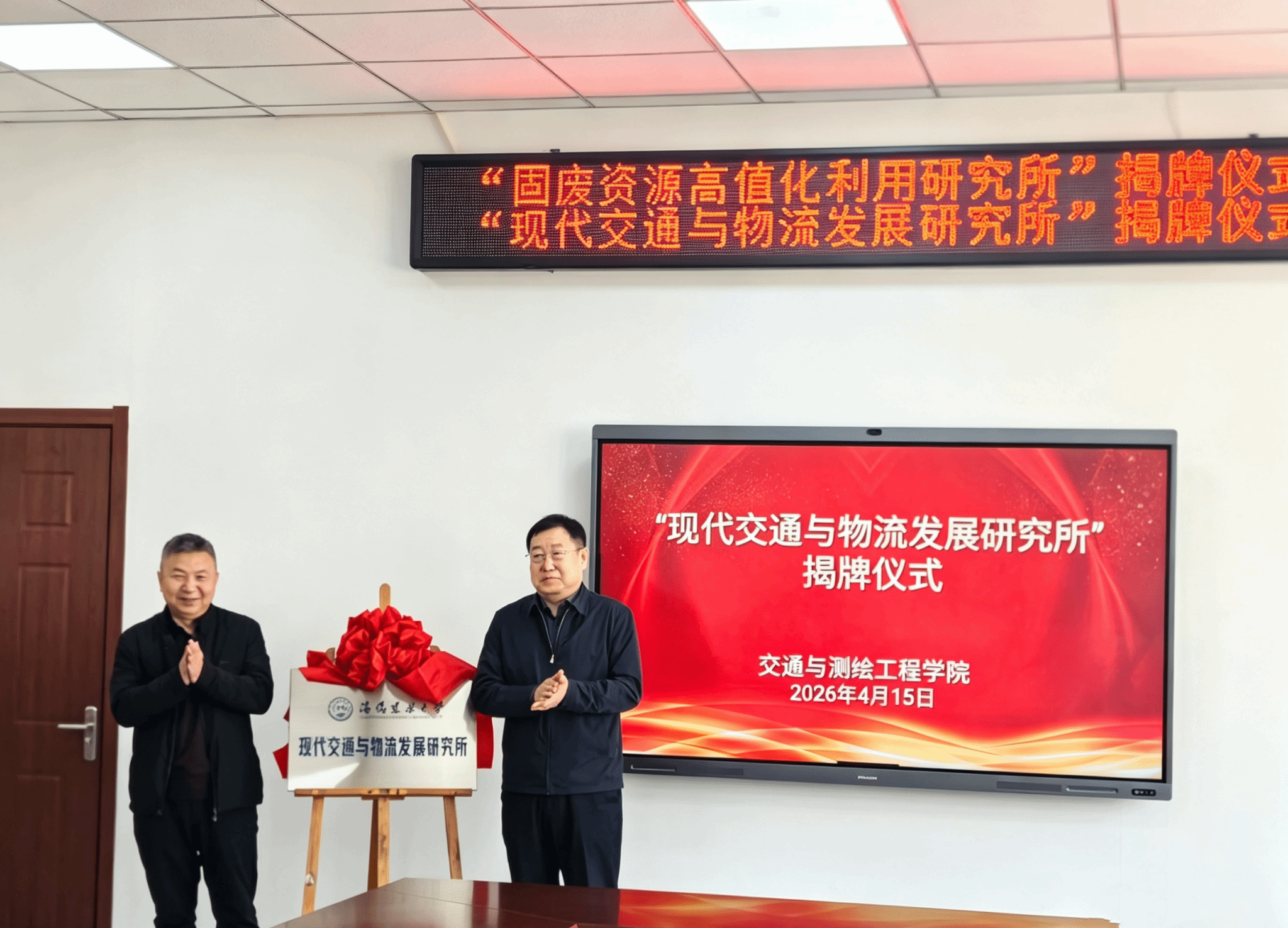仪式最后,王凤池分别与交通与测绘工程学院、科学技术研究院负责人为 “固废资源高值化利用研究所”“现代交通与物流发展研究所”揭牌。
