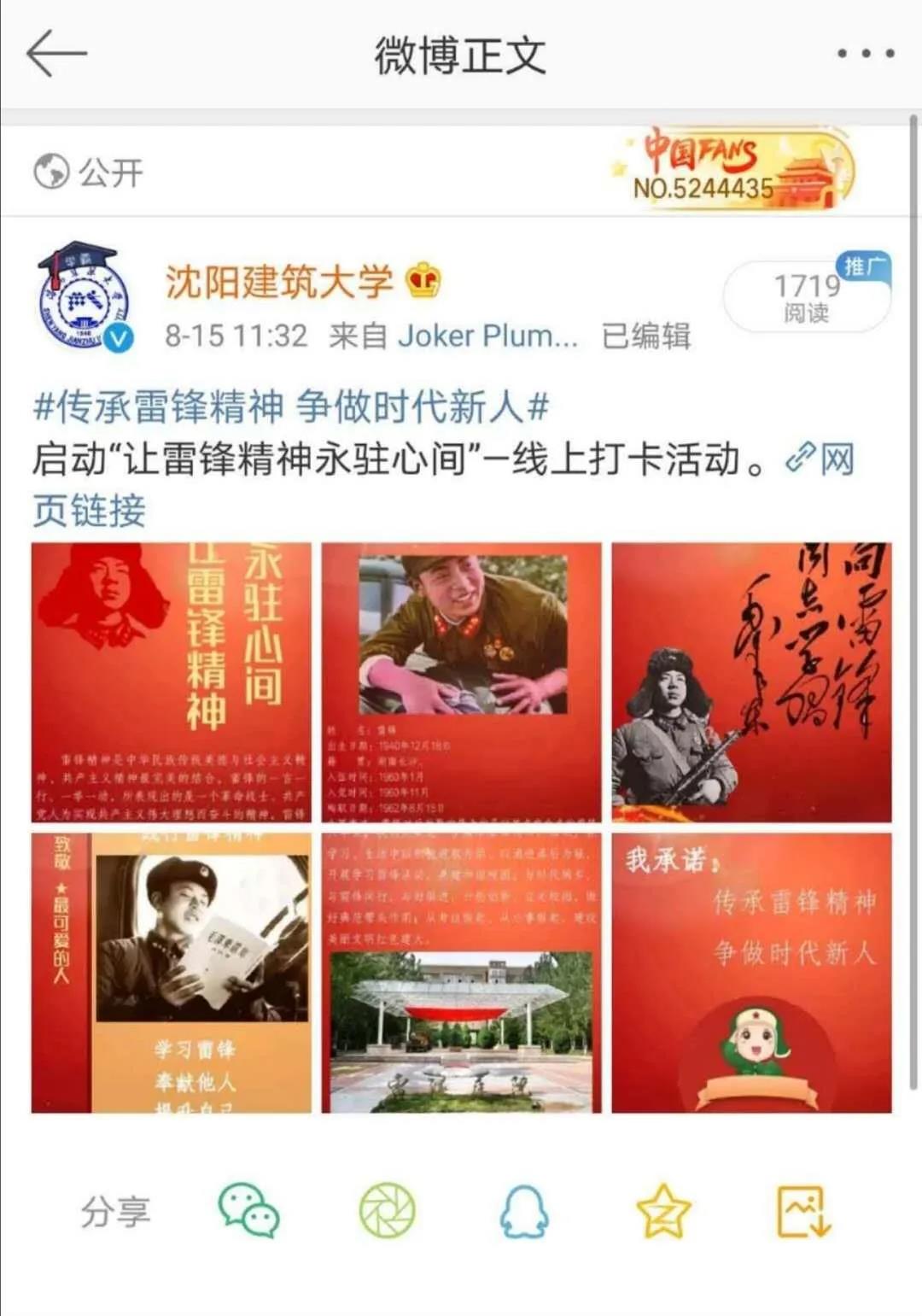 在8月15日开展学雷锋主题纪念活动是学校坚持用雷锋精神明德育人的优良传统,更是学校精心培育“雷锋文化”,打造“雷锋校园”的一项特色思政品牌工作。疫情防控期间,学校师生员工在雷锋精神的指引下,主动担当、恪尽职守,不计得失、勇于奉献,扎实抓好疫情防控与教育教学,集中展现了建大师生勇于担当的建大精神、有令必行的优良作风和无私奉献的崇高品德。