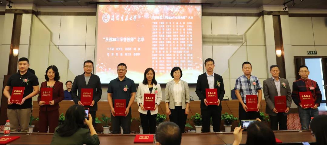 信息学院李孟歆、管理学院李丽红、体育部潘静伟分别代表优秀教师、师德标兵和“从教30年荣誉教师”发言。铿锵有力的话语表达了建大人不忘教育报国初心、牢记铸魂育人使命的拳拳真情,他们纷纷表示,将在今后的工作中积极发挥作用,为学校发展再立新功,用扎实奋斗为党和国家的教育事业、为中华民族伟大复兴的中国梦贡献力量!