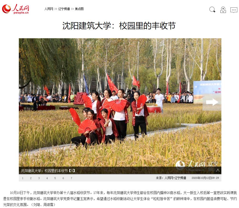 人民网对本次活动进行了全方位报道。“人民网总站”于10月12日在首页焦点图中发布了我校举办第十八届水稻收获节活动的图片。链接显示了“人民网>>辽宁频道”以《沈阳建筑大学:校园里的丰收节》为题的组图报道,选用了7张当天活动场景的照片轮播,全面展示了师生们下田收割、体验劳动之美、感受丰收的喜悦之情,同时也展现了建大人用收获的喜悦表达了对祖国的热爱和祝福,在校园内营造浪费可耻、节约为荣的浓厚氛围。“人民网>>辽宁频道>>人民视频”用2分11秒的视频新闻生动展现了活动中领导致辞、旗帜交接、歌舞表演等各个环节。