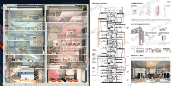 建筑内部的核心筒运转着对回收衣物布料的消洗、再加工的工厂,夹在之间的是一个个垂直经营的快时尚品牌专营店。在内部核心筒工厂内,交通是连接各个工厂加工站和商家的唯一方式。工厂的内部墙壁根据布料的材料特性进行了柔化处理,多为曲线的形式。