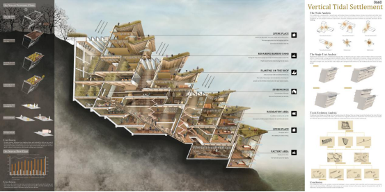 湄公河是老挝的生命之河。千百万年来,老挝所有生物都依赖这条生命之河而繁衍栖息,人们在此捕鱼、生活、种植、买卖。我校建筑与规划学院学生获奖作品希望通过摩天大楼的设计,满足老挝渔民居住的要求,为老挝渔民营造安全、轻松的捕鱼环境,同时在旱季为他们带来新的经济收入。