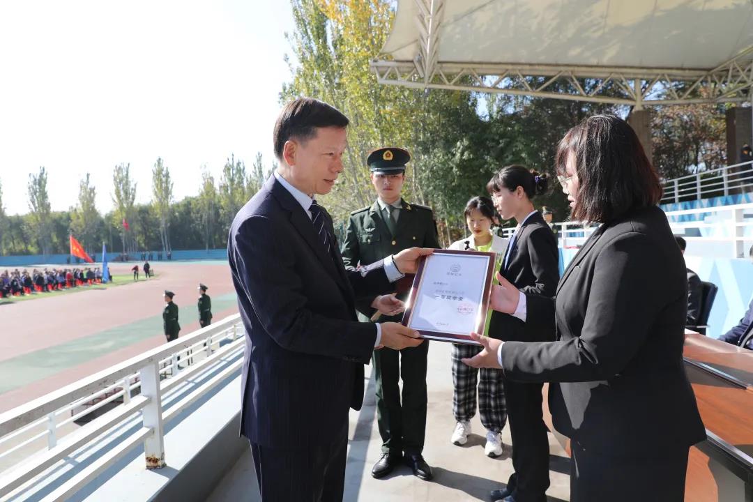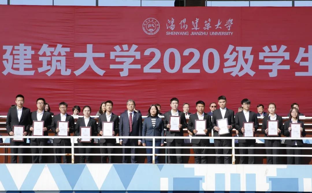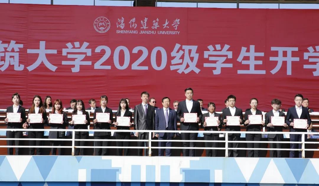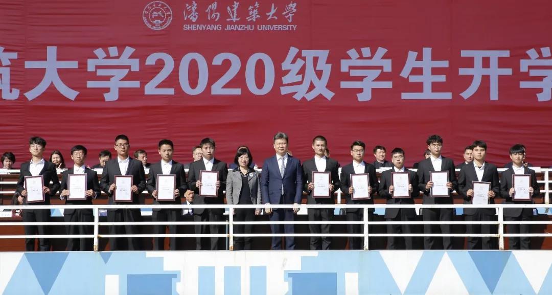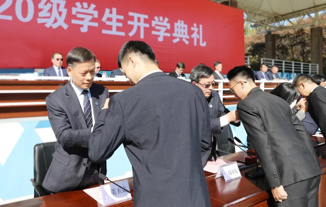 在雄壮的国歌声中,典礼拉开序幕。典礼上,表彰了2020年“辽建友新生入学奖学金”获得者和2020级优秀研究生入学学业奖学金获得者,与会领导为获奖同学颁奖。为不断提高学校生源,吸引更多优秀学生报考我校,学校分别制定了本科生和研究生新生入学奖学金奖励办法。其中,由校友发起和成立的“辽建友教育基金会”专门设立了“辽建友新生入学奖学金”,每年资助学校10万元,奖励以高分录取到我校的本科新生,今年,共有34名本科新生获得该项奖励。此外,学校还投入300余万元设立博士、硕士研究生入学学业奖学金,今年,共有19名博士研究生、599名硕士研究生获得奖励。董玉宽为“辽建友新生入学一等奖学金”获得者颁奖,勉励同学们奋勇拼搏,用实际行动描绘大学生活的美好画卷,立志成才、报效祖国。