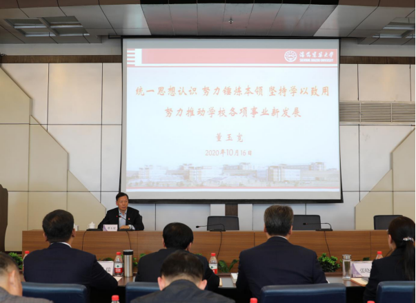 校党委副书记、校长阎卫东以“凝心聚力,团结奋进,全面推动学校高质量发展”为题,围绕我校各项事业高质量发展目标,结合编制我校“十四五”规划工作,总结了我校当前工作情况,分析了当前高等教育新形势,指出未来一段时期我校面临的重要任务和存在的不足。他就客观总结学校在“十三五”规划实施情况的基础上,加强工作调研、充分联系实际、认真分析研究、科学编制好我校“十四五”规划、推动我校各项事业新发展工作明确了思路和任务。