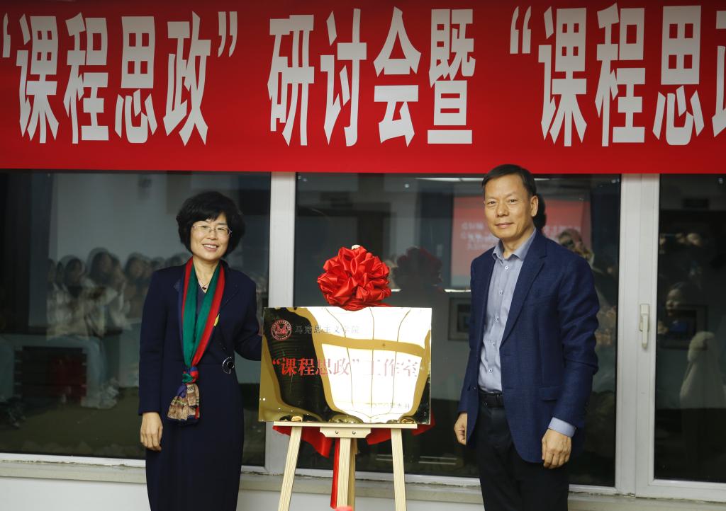 活动中,董玉宽为“课程思政工作室”揭牌并讲话。他强调了召开本次研讨会的重要意义,指出做好课程思政事关立德树人、关乎学科建设,一定要按照习近平总书记的重要讲话精神和中央出台的相关文件要求,鼓足干劲、拿出勇气,认真贯彻落实好各项决策部署。他回顾了我校“课程思政”建设工作的发展历程,充分肯定了学校近年来“课程思政”教学改革所取得的成果,并就立足学校实际、全面抓好课程思政建设提出四点要求:一是要抓住教师这一关键主体,构建“三全育人”大格局。打铁还需自身硬,要按照习近平总书记提出的“六个要”要求强化教师队伍建设;二是要充分发挥马克思主义学院在思想政治教育工作方面的优势,结合不同课程特点、思维方法和价值理念等,帮助专业课教师深入挖掘“课程思政”元素,有机融入课程教学;三是要认真研读、领会近几年教育部发布的一系列相关文件和习近平总书记在学校思想政治理论课教师座谈会上的重要讲话精神,真正做到教有方向、学有目标;四是要强化党委主体责任,进一步加强“课程思政”建设的组织实施和条件保障。