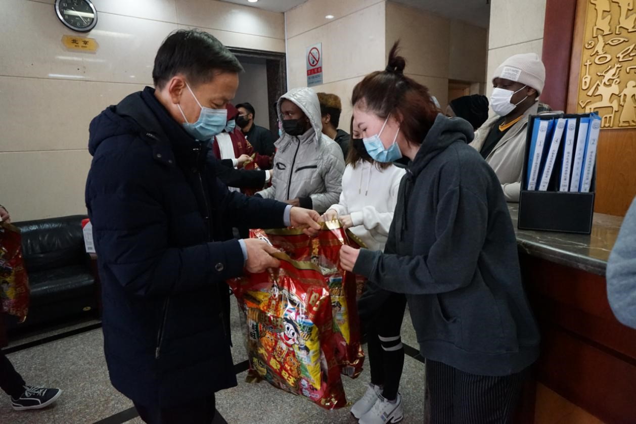 在留学生公寓,校领导查看了所有留校留学生的生活保障情况,与工作人员和部分留学生进行交流。李宇鹏对国际学院积极应对疫情所取得的成绩给予肯定,她要求,国际学院要继续再接再厉,认真执行学校对于疫情防控工作的相关部署,克服困难做好留校学生的管理和服务保障,切实保障寒假期间留校学生的学习生活和身体健康。