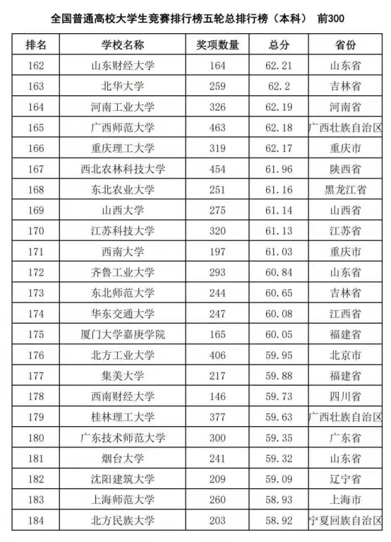 全国普通高校大学生竞赛排行榜,即全国普通高校学科竞赛评估结果榜单,是中国高校创新人才培养暨学科竞赛成果的排行榜,是由中国高等教育学会“高校竞赛评估与管理体系”专家工作组研究发布,为高校提高人才培养质量提供服务性参考信息,是检验高校创新人才培养质量的重要标准之一。全国普通高校学科竞赛排行榜依据权威性、影响力和国际性原则,每年遴选若干全国大学生竞赛项目入榜,从获奖贡献、组织贡献和研究贡献三个维度对全国普通本科院校和高职院校的学科竞赛竞争力进行排行。