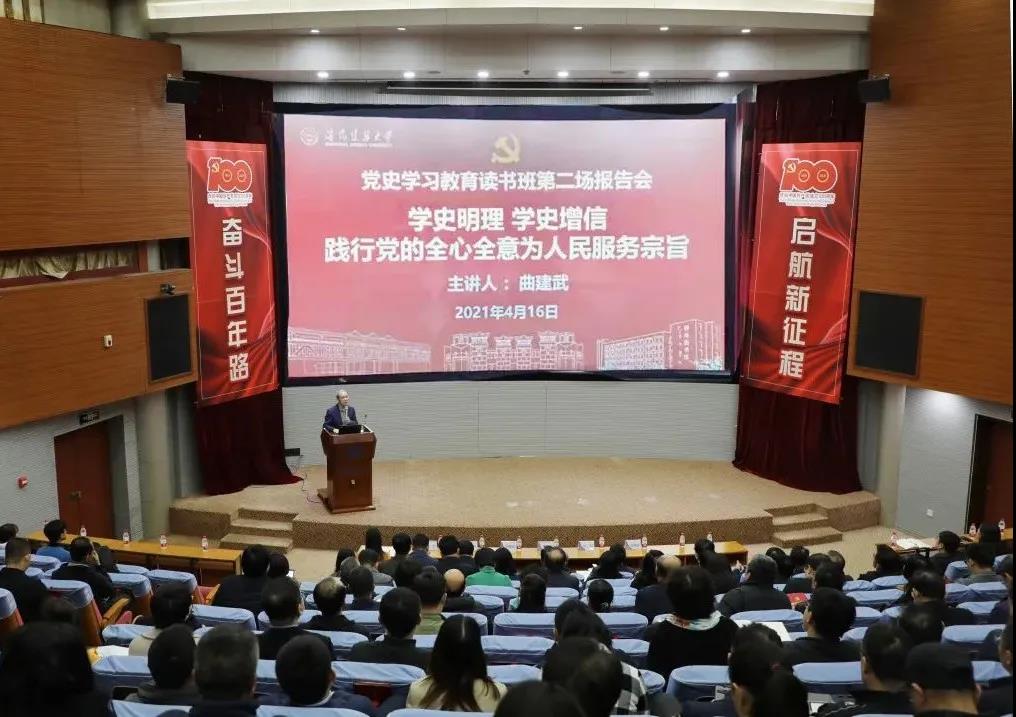 报告会上,曲建武以“学史明理、学史增信,践行党的全心全意为人民服务宗旨”为题,结合大量详实的党史资料,从革命战争年代、和平建设时期和改革开放以来这三个阶段,回顾了中国共产党成立以来的光辉奋斗历程,阐述了开展党史学习教育的重大意义。在报告中,他以李大钊、瞿秋白、夏明翰、赵一曼等优秀共产党人为了新中国诞生舍生忘死、抛头颅洒热血的先进事迹,阐释了坚定理想信念的重要性。以邓稼先、雷锋、焦裕禄、罗阳、黄大年为代表的一代代共产党人为国家富强、民族振兴、人民幸福艰苦奋斗,舍生忘我的大无畏精神,激励广大党员要深入学习党史,从党史中汲取干事创业的信心和力量,切实落实立德树人根本任务,担负起为党育人、为国育才的历史使命。