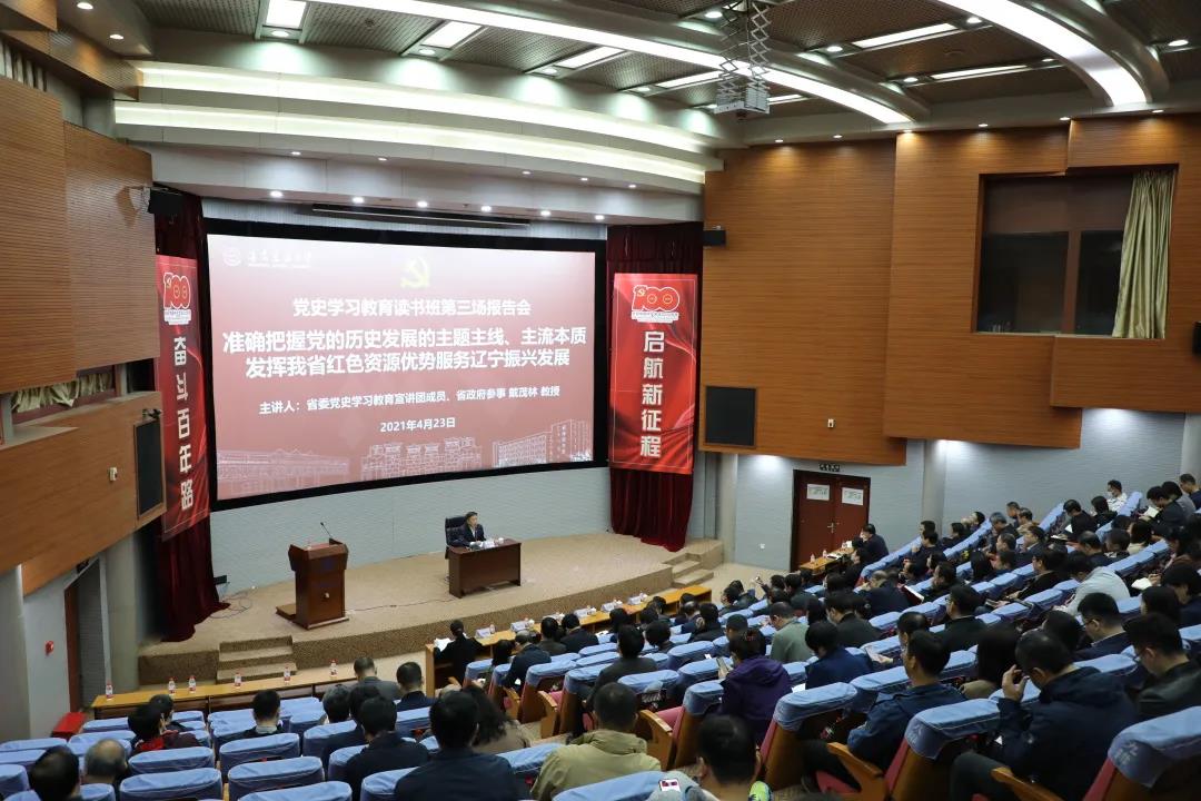 4月23日上午,学校党史学习教育读书班第三场报告会在新宁科学会堂举行。校党委书记董玉宽,党委常委、纪委书记、监察专员王利印,党委常委、副校长冯国会,党委常委、宣传部部长张晓雁出席并聆听报告。校院两级党委理论学习中心组成员参加报告会。省委党史学习教育宣讲团成员、省政府参事戴茂林教授受邀作报告。报告会由张晓雁主持。