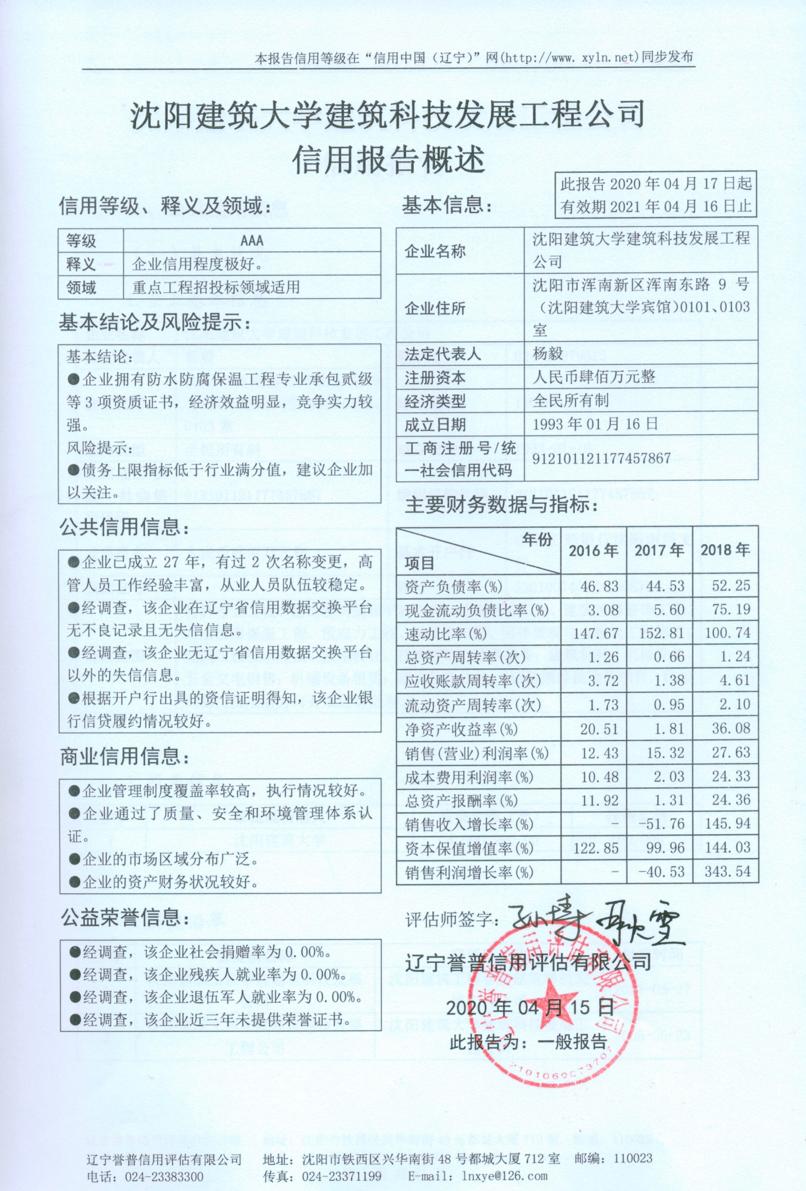 近日,我校建筑科技发展工程公司再次获得“AAA级信用企业”殊荣。此次信用等级评定,由企业自主申报,经多方机构对公司财务、纳税、执业资质、行业荣誉、合同履行及社会责任等方面进行综合评审,经多方评估后,最终评定公司为“AAA级”信用等级,为最高信用等级。