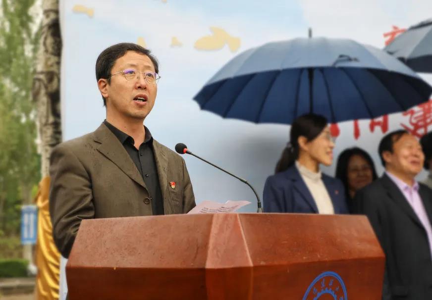 周晓东在活动中致辞。他表达了对袁隆平老先生的敬重和怀念、对我校稻田景观的肯定,同时对学校师生给予了衷心的祝福。