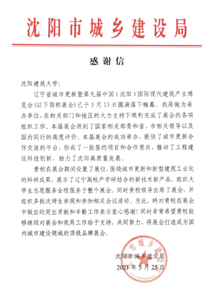 近日,沈阳市城乡建设局向我校发来感谢信,对我校领导高度重视并出席大会及参与签约活动、在展会中紧密围绕城市更新主题展示学校科技成果、组织大学生志愿者全程服务于整个展会、组织多批次师生参观和参加相关会议活动等方面的突出贡献和辛勤工作表示衷心感谢。