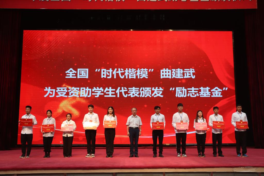 曲建武为受资助学生代表颁发“励志基金”,并对全体受资助学生提出四点希望:一是自强不息,坚定信念。希望同学们从党的百年伟大奋斗历程中汲取前进的智慧和力量,坚守人生信念,自强不息、孜孜追求,让青春焕发出无限活力;二是努力学习,实干兴邦。希望同学们努力学知识、长本领、增才干,学有所成,做到用学习充实人生,用知识成就自我,早日成为国家栋梁;三是团结互助,共同进步。希望同学们能够弘扬团结互助的中华民族传统美德,在团结互助、心灵交融中产生共鸣、迸发力量,切实承担起建设祖国、促进社会和谐发展的重任;四是锻炼身体,强健体魄。希望同学们把坚定理想信念与练就强健体魄相结合,以具备强健体魄为基础,精神百倍、意气风发地迎接学习生活中的种种挑战,体会工作和学习的快乐。