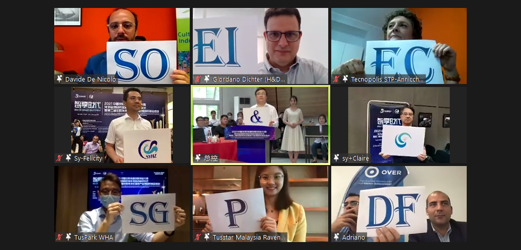 会议的启动仪式充满了创新的色彩,阎卫东、张珂与吴智丰一同与来自比利时的H&D伙伴公司、意大利泰克诺普利斯科技园以及启迪马来西亚、启迪泰国的多国合作伙伴,以每个视频窗口字母集合的形式,将会议名称缩写展示在屏幕上,用后疫情时代的特殊方式正式开启活动。