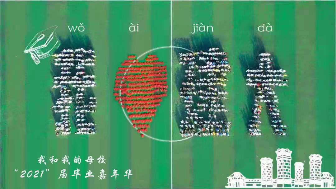 在“我爱建大”千人摄影区,毕业生身穿纪念衫,纷纷来到充满四年时光印记的第一塑胶体育场,近千名毕业生共同摆出“我爱建大”四个字,将自己对母校的感恩与不舍融入照片中。
