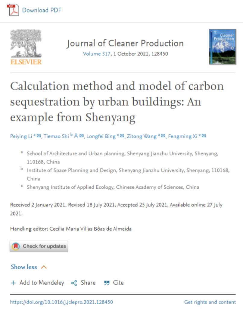 近日,我校空间规划设计研究院院长石铁矛教授与其博士研究生李沛颖、团队合作研究人员邴龙飞等合作的论文Calculation method and model of carbon sequestration by urban buildings: an example from Shenyang(城市建筑碳汇计算方法与模型:以沈阳为例),在环境科学-工程领域国际权威Top期刊《Journal of Cleaner Production》上发表(文章发表在线网址:https://doi.org/10.1016/j.jclepro.2021.128450)。