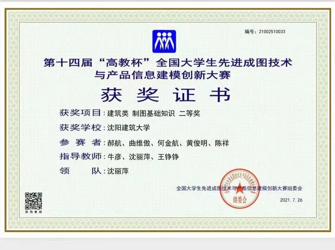 7月24日至26日,由西南交通大学承办的第十四届“高教杯”全国大学生先进成图技术与产品信息建模创新大赛落下帷幕,来自全国551所高校的6743名选手以线上实时监控的形式参加了比赛。由我校理学院教师牛彦、沈丽萍、王铮铮指导,环境学院学生陈祥、郝航、曲维傲、黄俊明、何金航组成的代表队首次参加建筑类比赛,经过一天限时激烈角逐,最终获得团体基础知识二等奖、团体总成绩三等奖。陈祥、郝航、何金航获得个人全能三等奖。