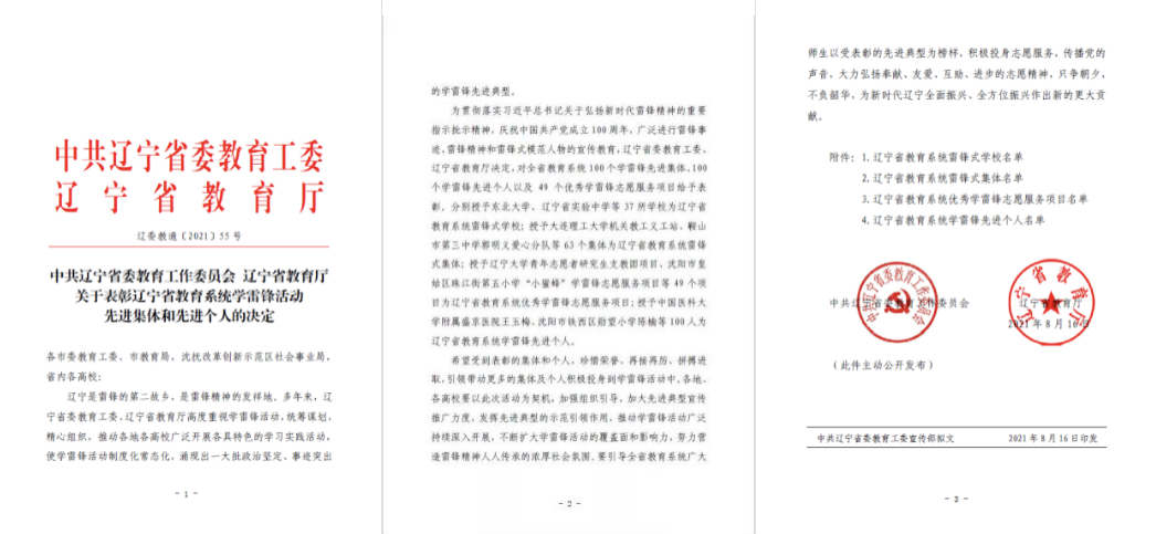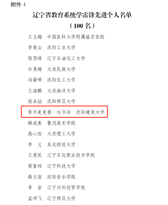 近日,中共辽宁省委教育工作委员会、辽宁省教育厅印发了《关于表彰辽宁省教育系统学雷锋活动先进集体和先进个人的决定》,对近年来全省教育系统开展学雷锋活动中表现突出的先进集体和先进个人进行表彰,我校获评“辽宁省教育系统雷锋式学校”,努尔麦麦提·吐尔孙获评“辽宁省教育系统学雷锋先进个人”。
