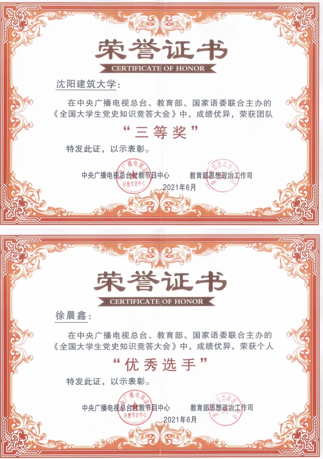 为深入学习贯彻习近平总书记在党史学习教育动员大会上的重要讲话精神,引导高校师生以昂扬的状态迎接中国共产党成立100周年,日前,教育部、中央广播电视总台联合举办了《全国大学生党史知识竞答大会》,我校积极组织参与,荣获团队三等奖,土木工程学院学生徐晨鑫荣获个人优秀选手奖。