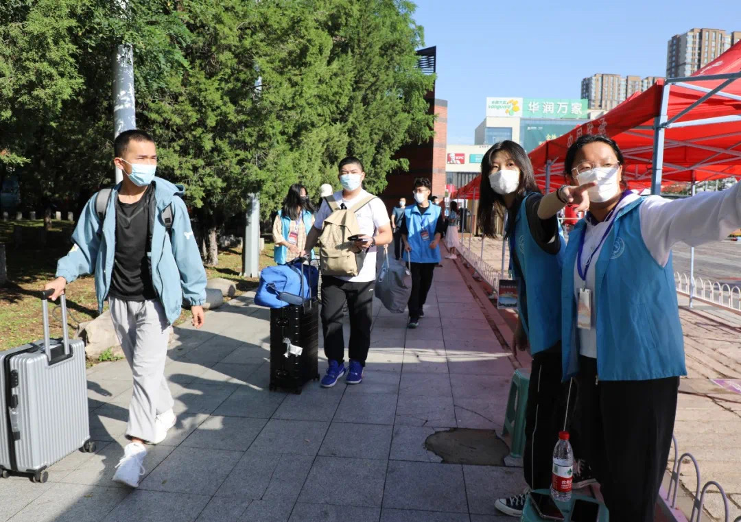 查看健康码、体温检测、核酸检测阴性证明……在校门口,学校严格本科生入校身份核验,新生们依次戴口罩进入校园。“请同学们间隔一米,有序排队,参加核酸检测!”进入学校后,省外新生按要求进行了入校后的二次核酸检测,现场有条不紊、秩序井然。校内各处高挂的横幅传递着对新生的祝福和期许,各学院迎新处、引导站、校级组织迎新站、志愿服务站早已准备就绪,相关工作人员和志愿者们笑容满面、以心迎新,热情周到的服务让新生倍感温暖。