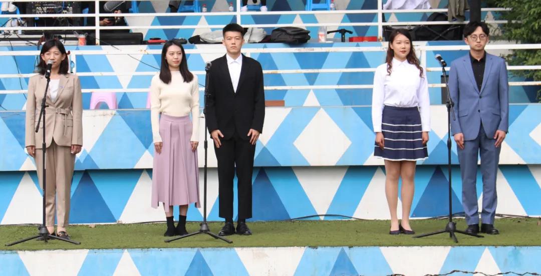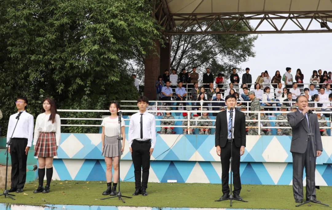 在雄壮激昂的国歌声中,五星红旗冉冉升起,开学典礼拉开序幕。典礼上,表彰了“从教30年荣誉教师”“2021年度优秀教师”和2021级学生军训工作优秀集体、先进个人,与会校领导为获奖集体和个人代表颁发了奖牌和荣誉证书。新教师代表满怀敬意和传承的信心,向获奖教师代表献上了鲜花。典礼前,董玉宽在军训汇报表演大会上慰问了2021级学生军训教官团,并为军事爱好者协会颁发突出贡献奖。我校2021级学生的军训工作继续采取自训模式,来自我校军事爱好者协会的学生教官认真负责、严格训练,出色地完成了2021级学生军训的各项任务。