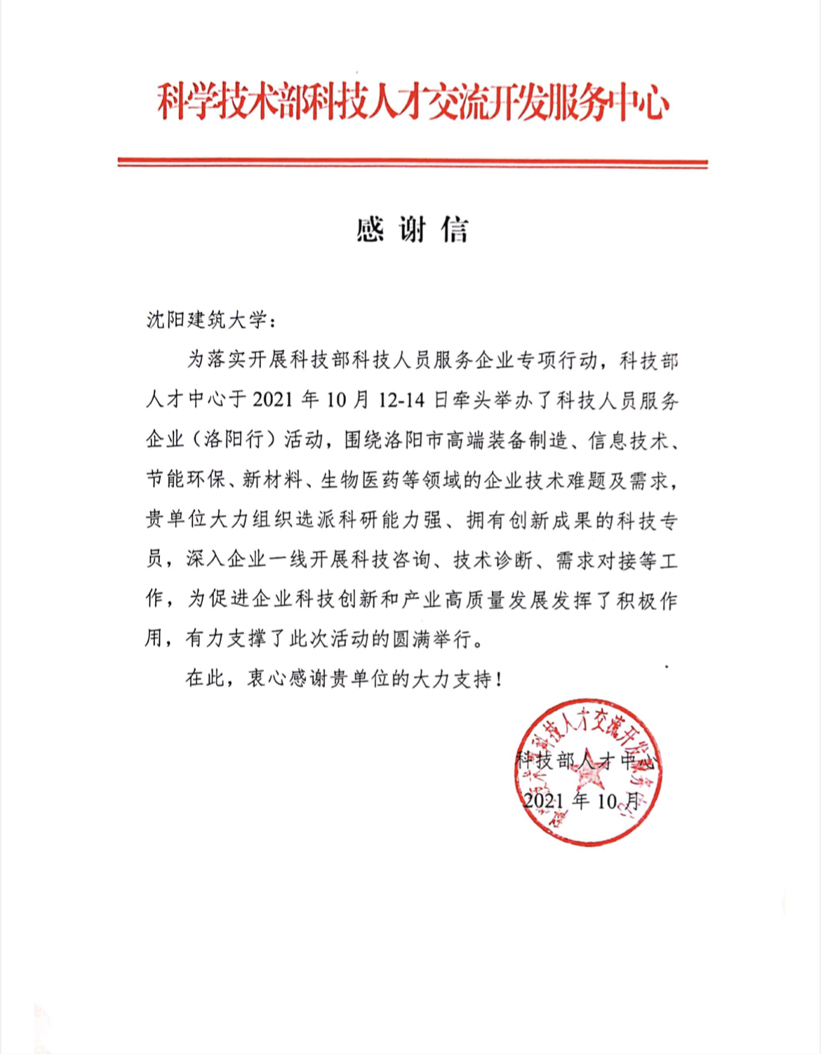 近日,科学技术部科技人才交流开发服务中心向我校发来感谢信,对我校李颂华教授团队在科技领军人才服务企业(洛阳行)活动中的贡献和辛勤工作表示衷心感谢。