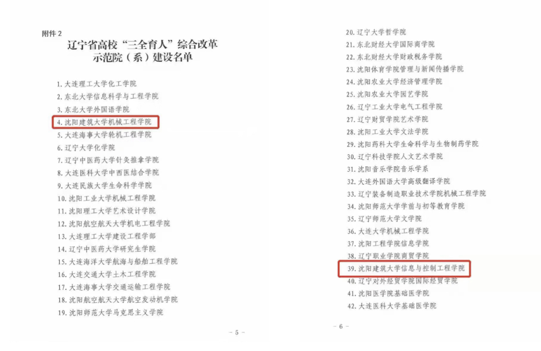 1月18日,辽宁省委教育工委、辽宁省教育厅印发了《关于公布辽宁省高校“三全育人”综合改革示范项目建设名单的通知》,我校获评辽宁省“三全育人”示范高校,机械工程学院、信息与控制工程学院获评辽宁省高校“三全育人”示范院(系),《“‘一班一师一友’三全育人新模式”——沈阳建筑大学交通工程学院》《“实施五位一体课程建设计划,构建课程思政育人大格局”——沈阳建筑大学教务处》获评辽宁省高校“三全育人”示范案例,我校文化育人研究与宣传展示基地获评辽宁省高校“三全育人”开放基地。