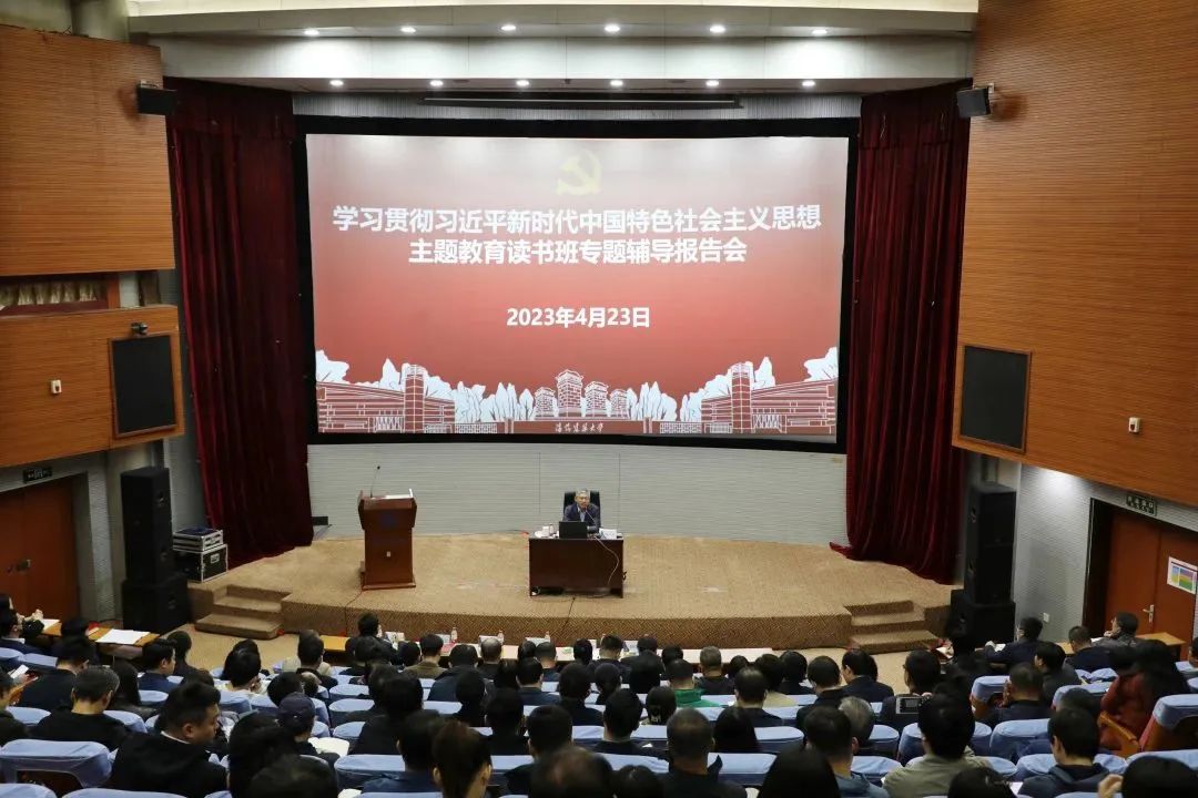 根据省委部署要求和学校主题教育工作安排,4月23日上午,学校学习贯彻习近平新时代中国特色社会主义思想主题教育读书班专题辅导报告会暨党委理论学习中心组集体学习会在新宁科学会堂举行。校党委书记董玉宽,副校长严文复,党委常委、纪委书记、监察专员王利印,党委常委、副校长冯国会,党委常委、统战部部长曹传明,党委常委、组织部部长潘瑞出席报告会。校院两级党委理论学习中心组成员、思政课教师代表、全体辅导员、专兼职组织员200余人参加了报告会。中共辽宁省委党校党建教研部主任牟广东教授应邀作读书班首场报告。